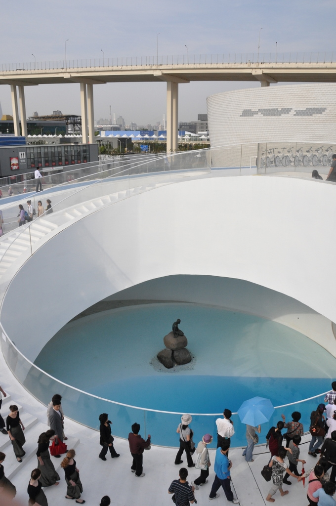 De vijver in het midden van het Deense paviljoen is gevuld met water uit de haven van Kopenhagen (glashelder!) met middenin het ECHTE kleine-zeemeermin beeld dat speciaal hiervoor een half jaar naar China gehaald is